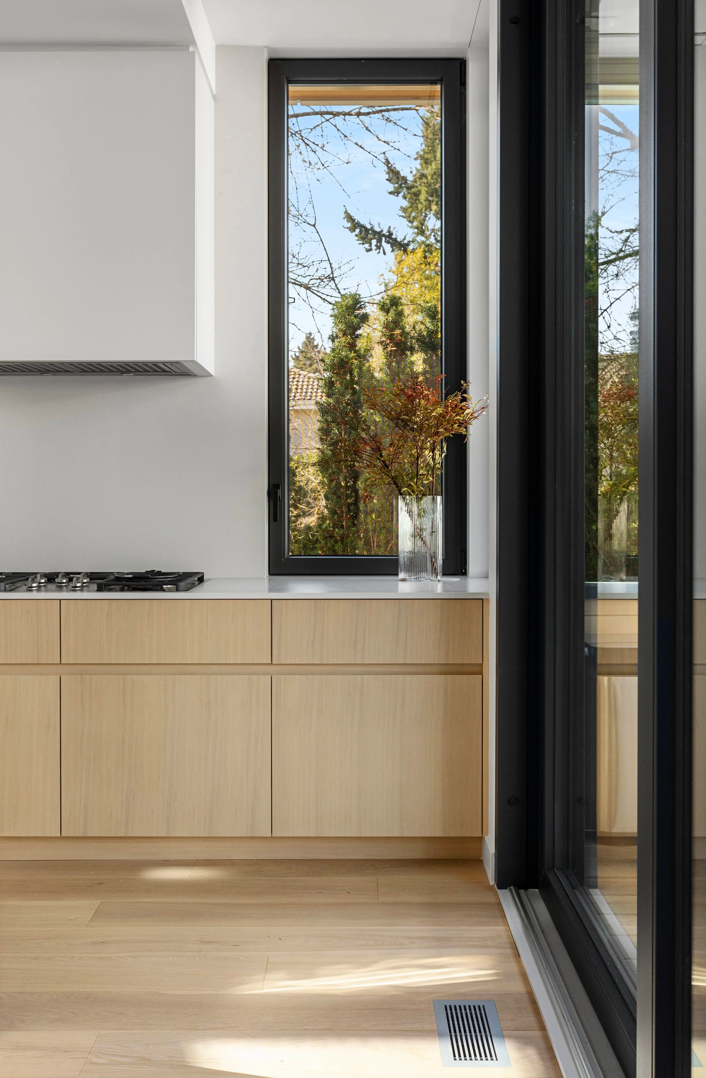 This project features a contemporary residential interior in Vancouver, designed for a young family with a focus on spaciousness and natural light. The open floor plan connects living areas to improve flow and everyday functionality. Storage was a key priority, so we created smart, integrated solutions to accommodate the family’s love of outdoor activities such as camping and sports. Custom cabinetry provides both ample storage and visual consistency, while streamlined furnishings support a clean, minimalist look. Playful elements add warmth to the design, balancing sophistication with a family-friendly atmosphere. Smart home technology offers convenience without compromising design integrity, while a neutral palette and subtle detailing establish a calm, balanced environment suited to modern family living.