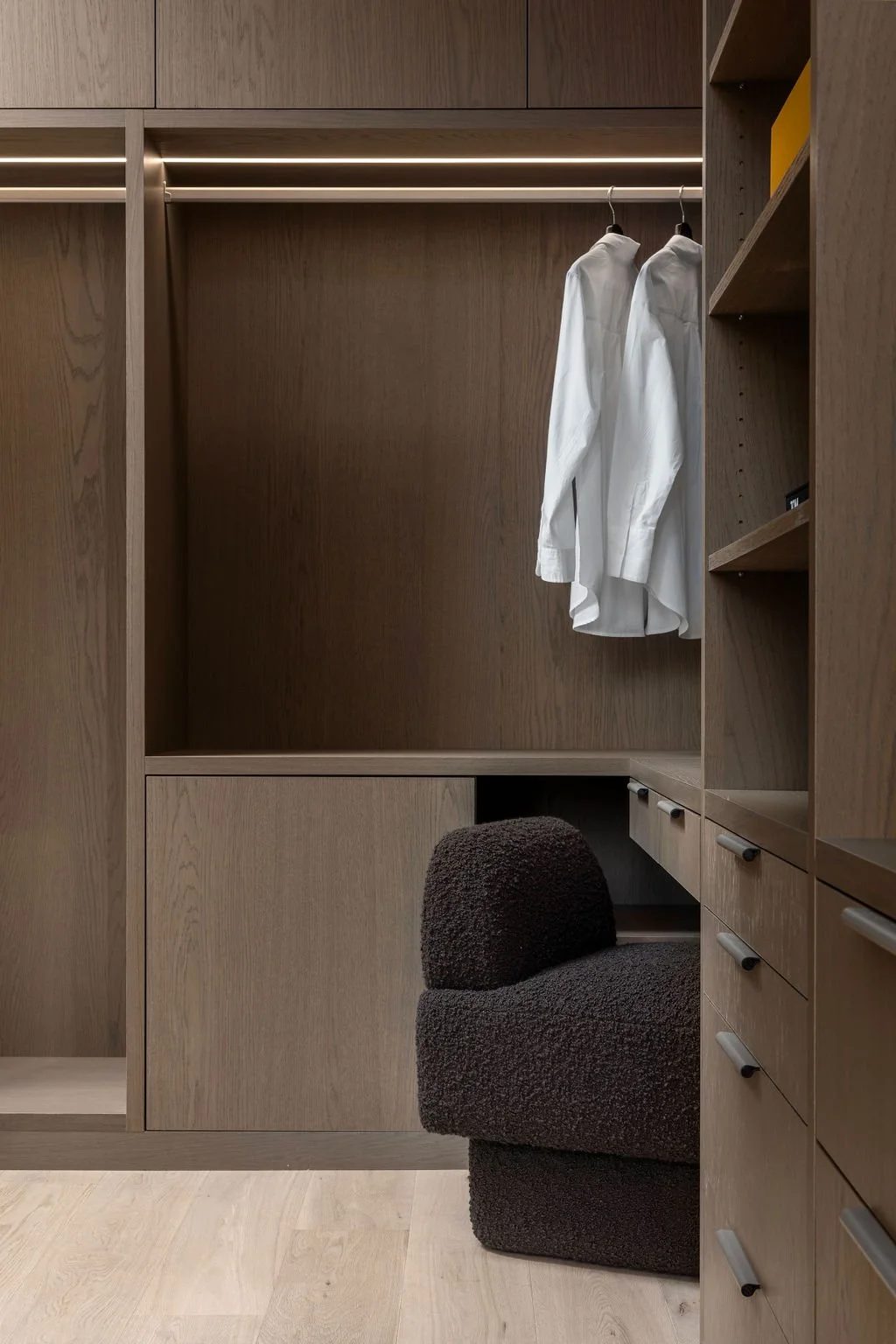 The vanity features a minimalist countertop, spacious drawers for cosmetics, and integrated lighting. A sliding-door vanity mirror was designed with discreet pockets that neatly conceal the doors when open, offering flexible use of the mirror. Sensor-activated LED strip lights illuminate the space as the doors open.